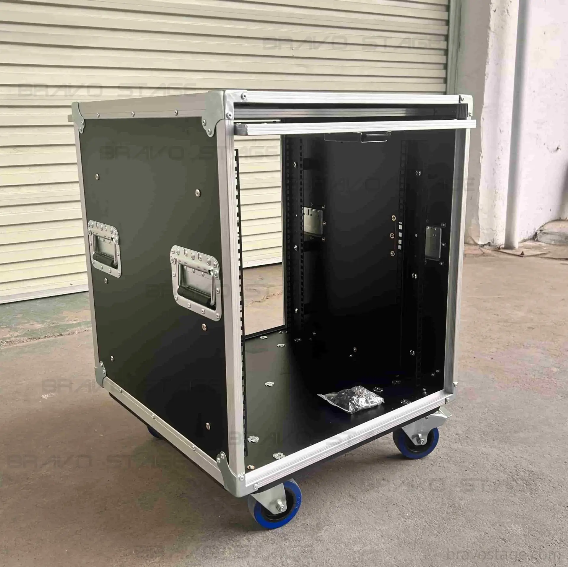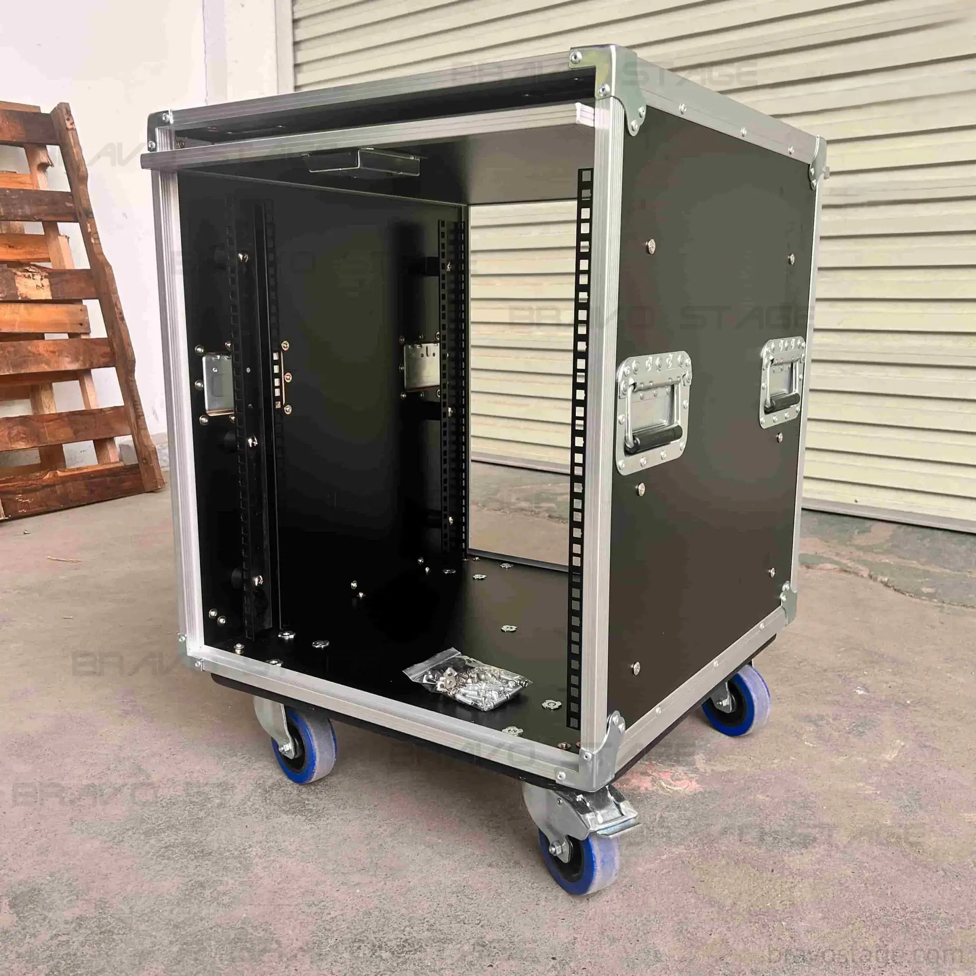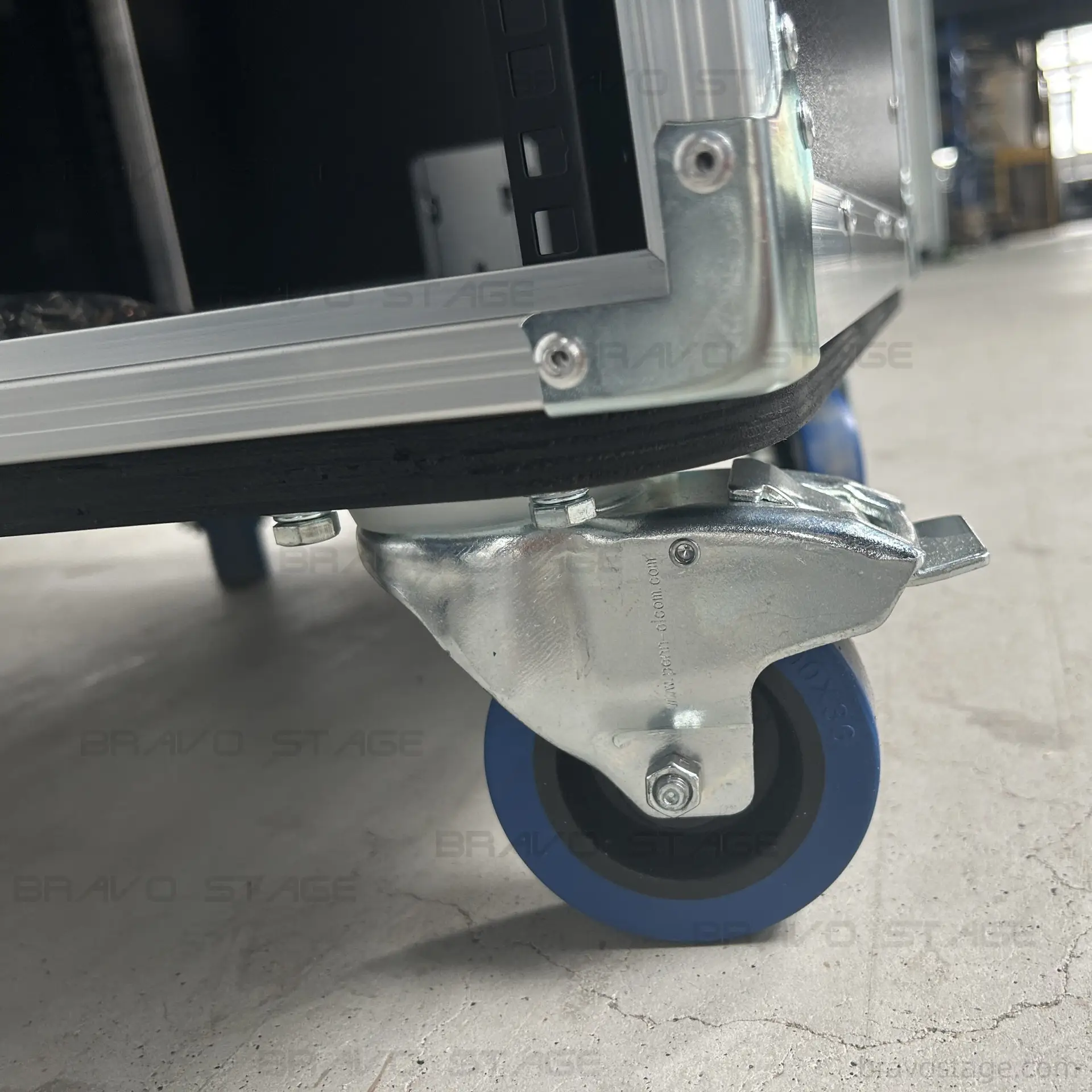 • Premium Case Hardware: Crafted with premium materials and precision engineering, our 12U Slam Rack boasts Penn Elcom slam latches for smooth, secure door closure. With Penn Elcom hardened steel corners, recessed spring-loaded handles, 12mm hard-wearing laminate plywood; aluminium edging; and sturdy 150KG 4” blue rubber Penn Elcom castors (2 with brakes), durability is guaranteed.