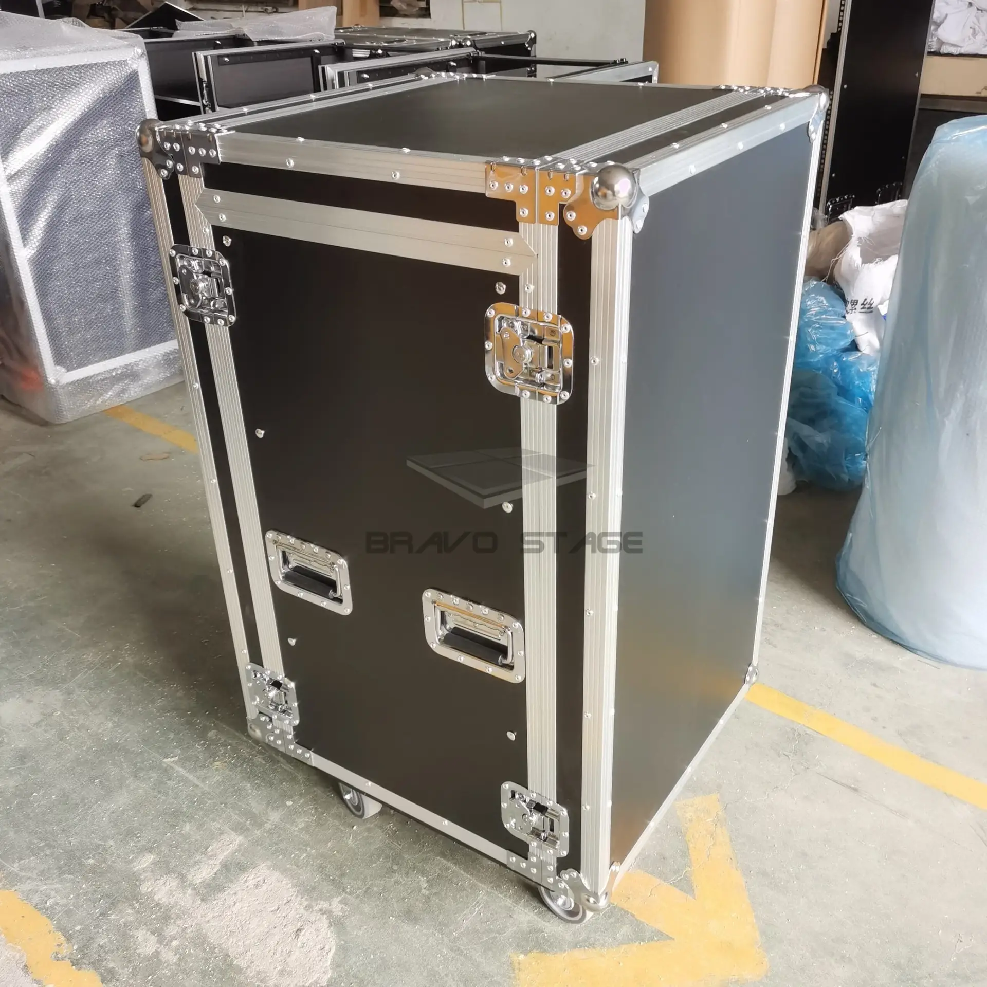 16U Space Vertical Shockproof amplifier rack case with 2 side tables and 4″ casters, is the perfect storage solution for durable security for a wide variety of amplifiers, pro DJ mixers, effects, and any other standard 19″ width rack-mountable Pro Audio/DJ/Network gear.