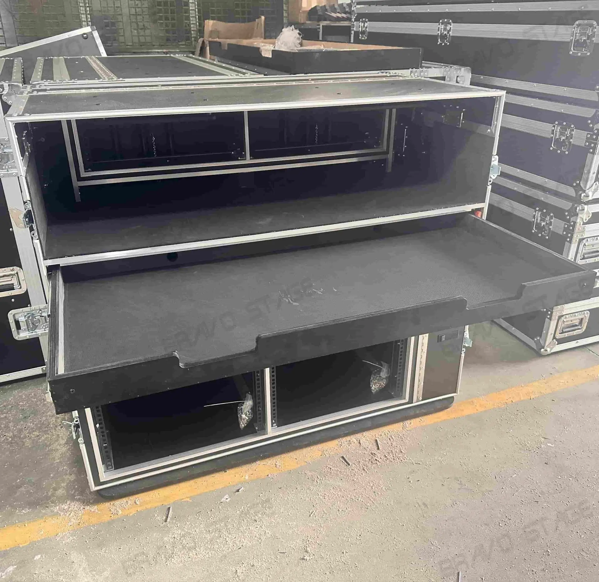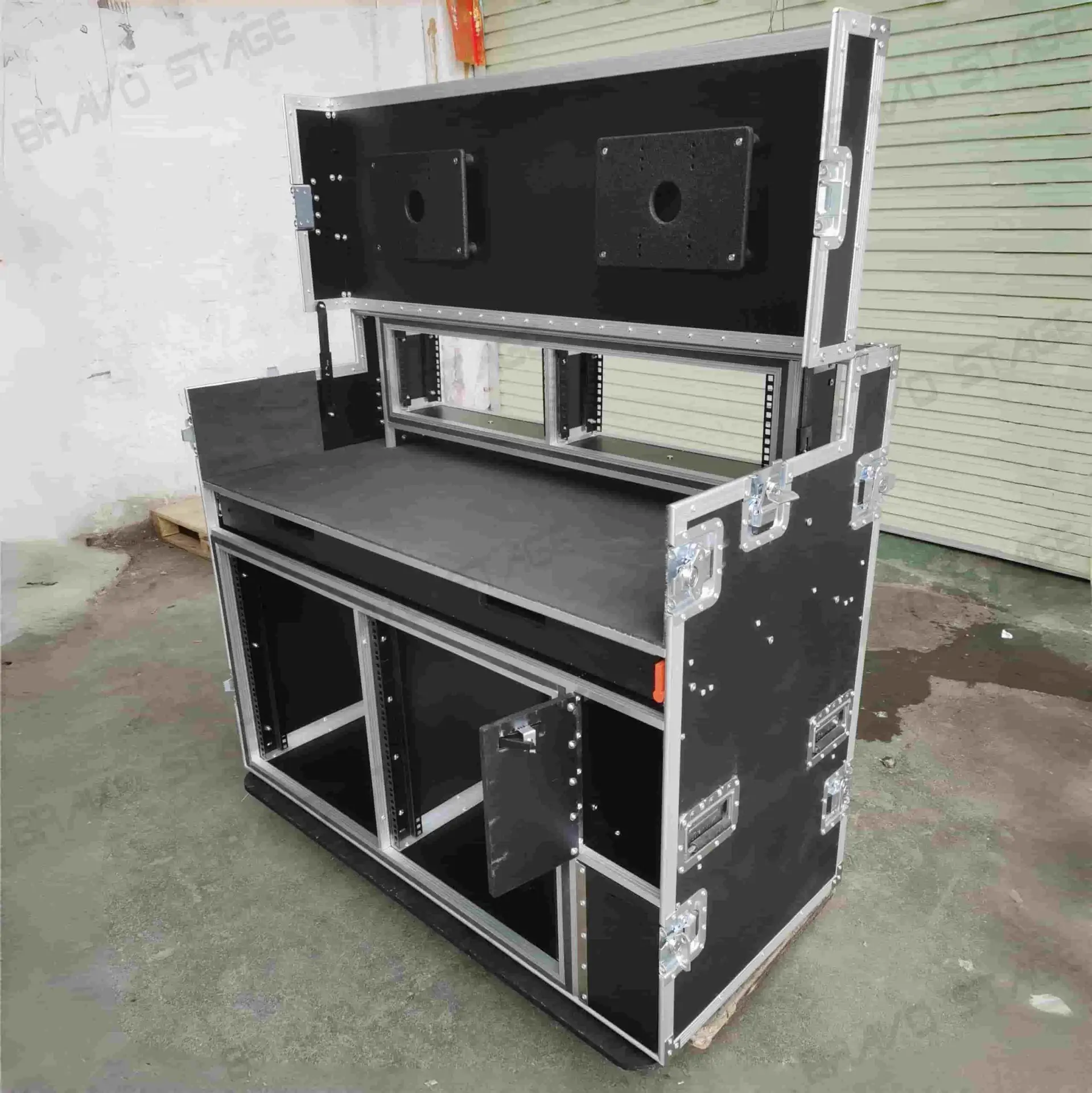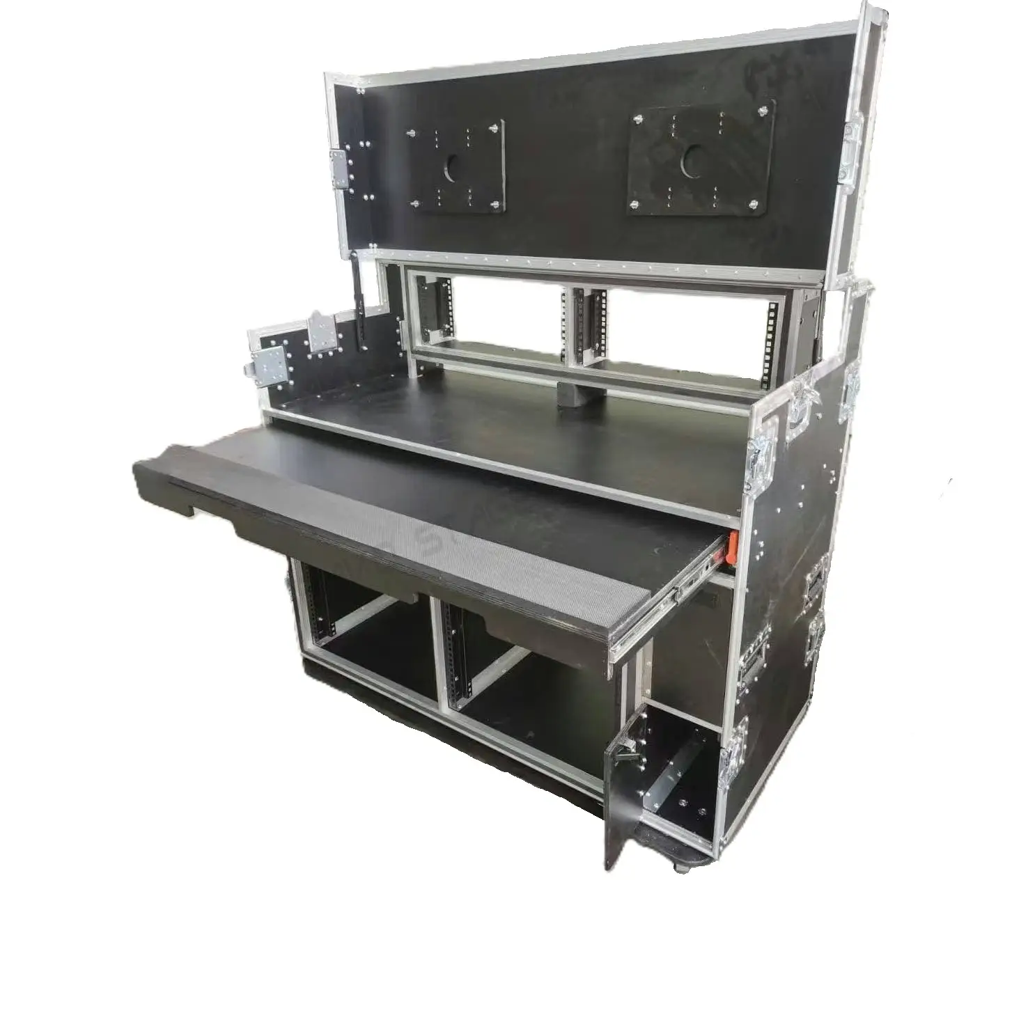 The top lid interior has mounting panels for up to two 24″ inch Monitors or a Single 48″ Monitor, It can be adjusted and set to your specific viewing angle. The desktop area space has a 2x4U Shockmount Rack Space and a Sliding shelf with a cushion arm rest for the PC keyboard/mouse/trackpad shelf. The Lower section of the case has 2x 12U Shockmount Rackspace. It also has a side door on the right with a split that allows you to fit up to two mini-tower computers or hardrive units. The front and back lids have folding legs that can be converted to two side tables for additional workspace. Each case is carefully assembled and comprised of birch plywood for long lasting quality.