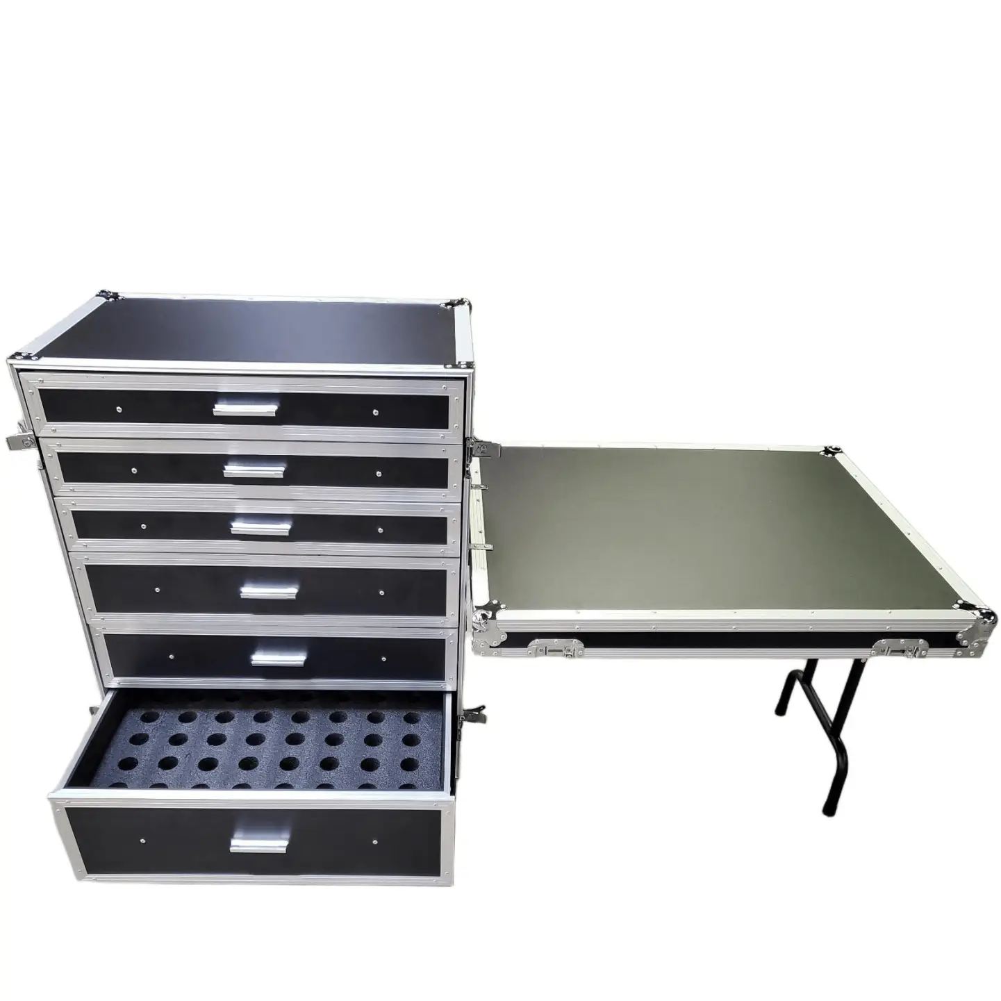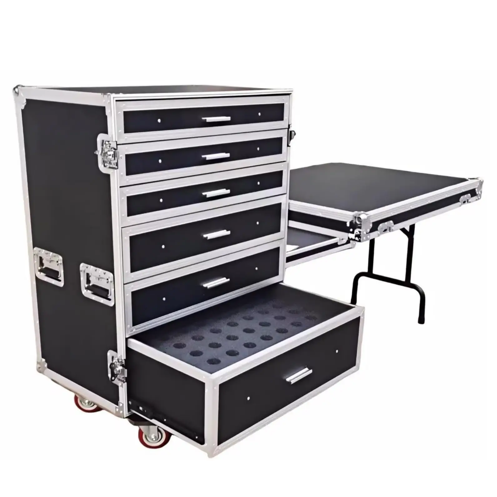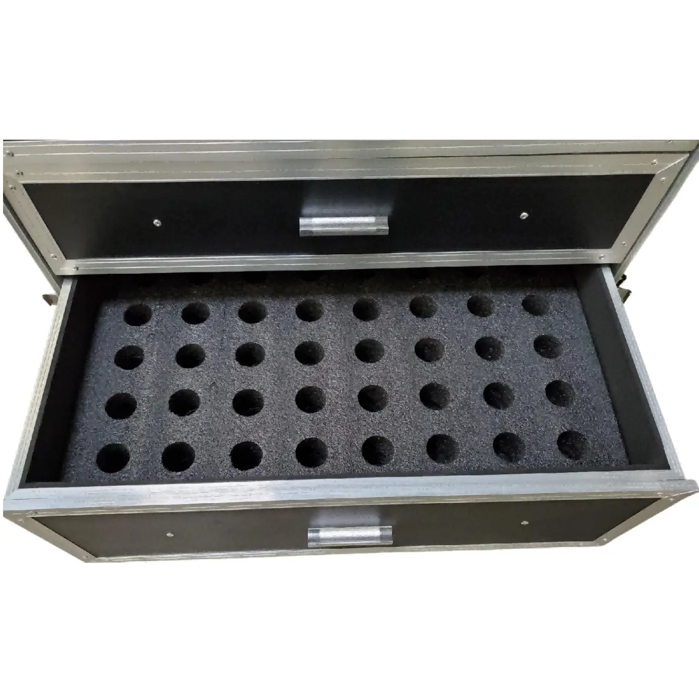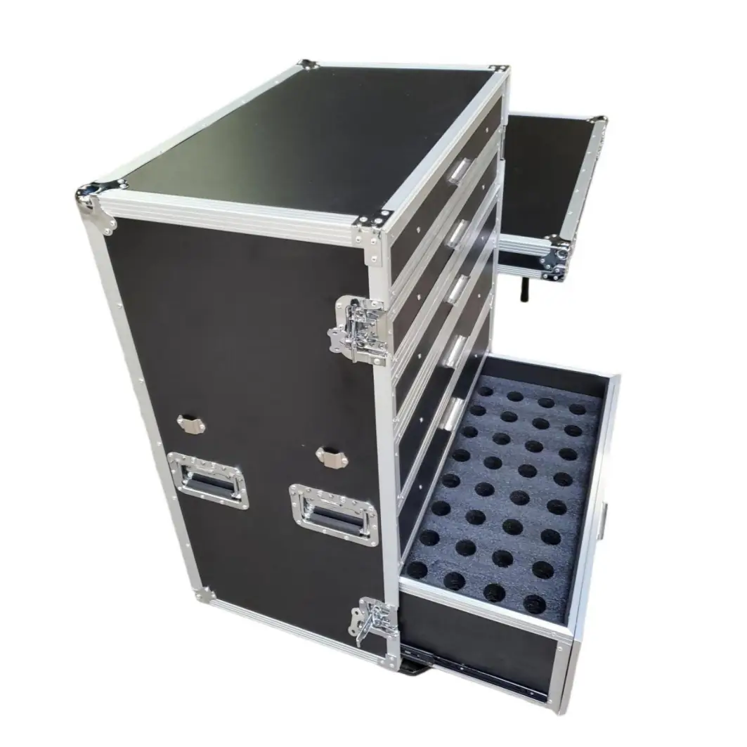 This workbox is design to hold a variety of mics, DI boxes and cables for audio presentations and concerts. The workbox features removable foam inserts in each drawer that hold each item in a custom cut compartment.