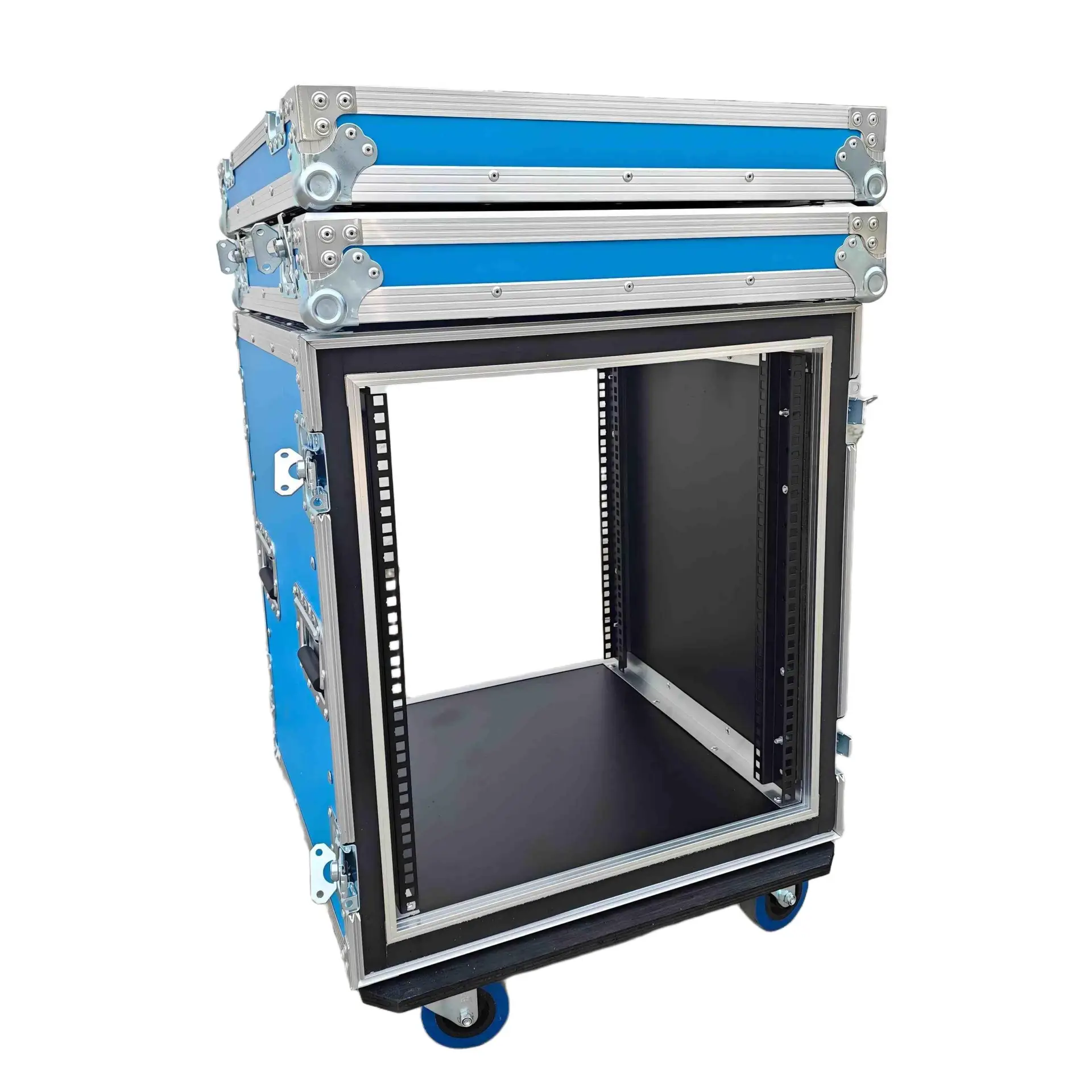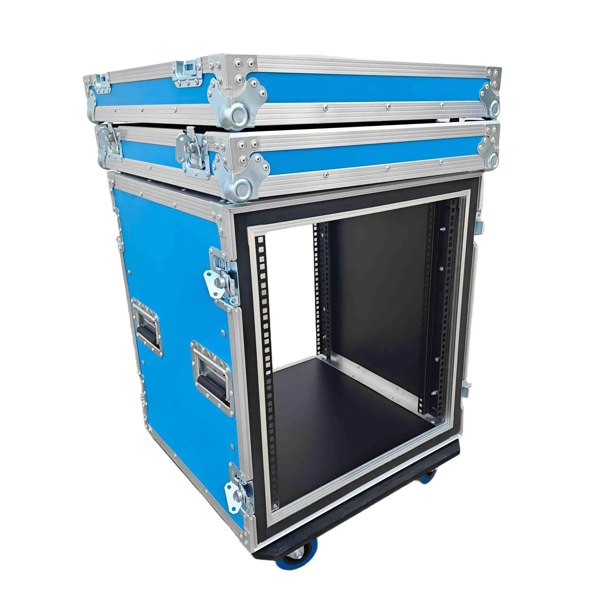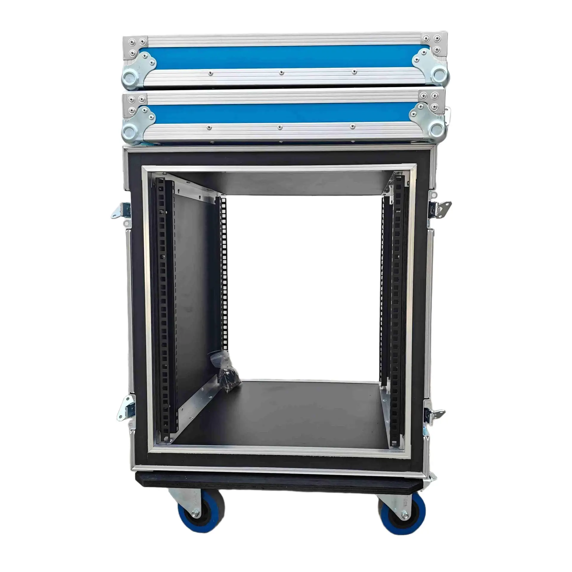 ATA Style 12U Shockproof Rack Mount Flight Case 20in. Depth with Caster Wheels. This meticulously crafted Shockproof Vertical Amplifier Rack Case serves as an exemplary storage solution, offering security and convenience for a diverse range of amplifiers, professional DJ mixers, effects units, and standard 19″ width rack-mountable pro audio/DJ/Network gear. Engineered with steadfast precision and equipped with dual mounting rails, this case assures unwavering equipment stability, eliminating the risk of displacement or slippage. Furthermore, the design prioritizes minimizing strain on rack ears, thereby enhancing overall durability and longevity.