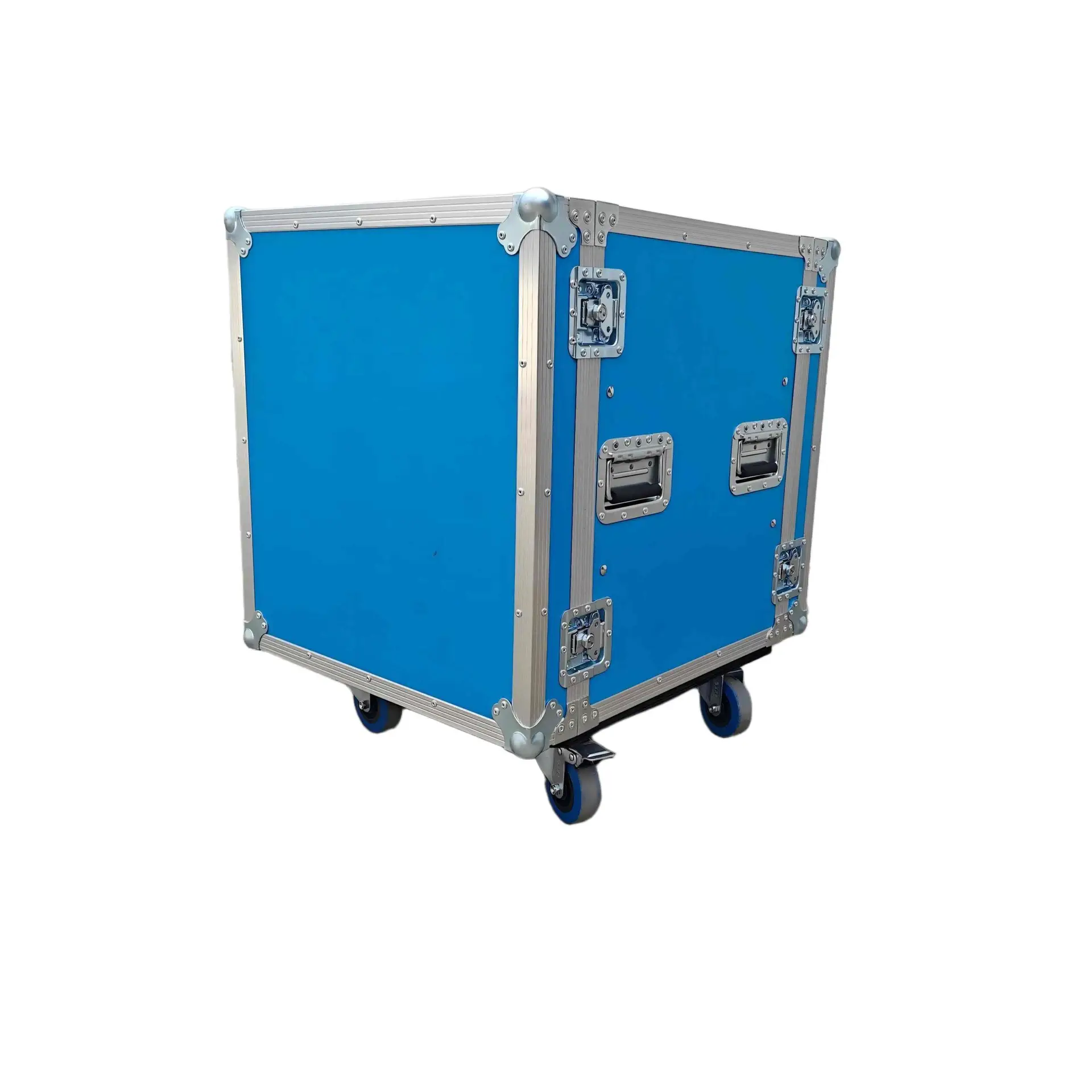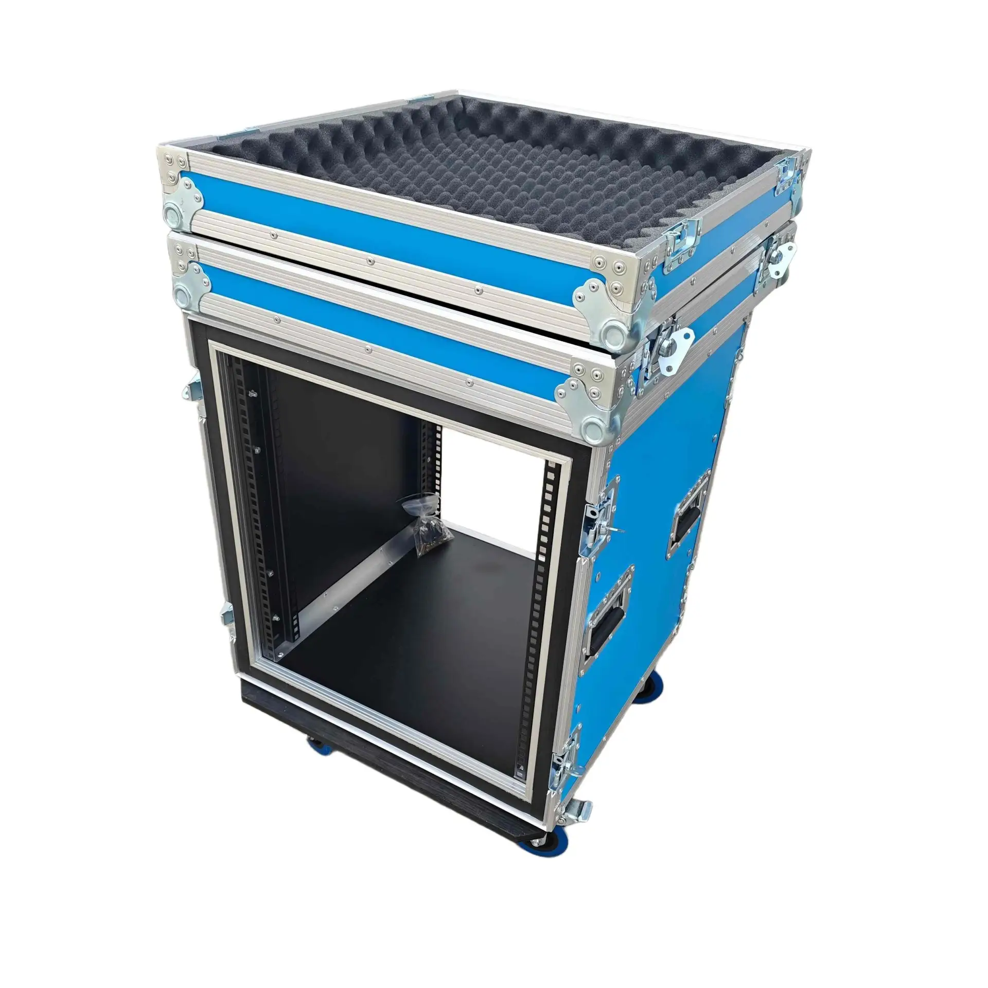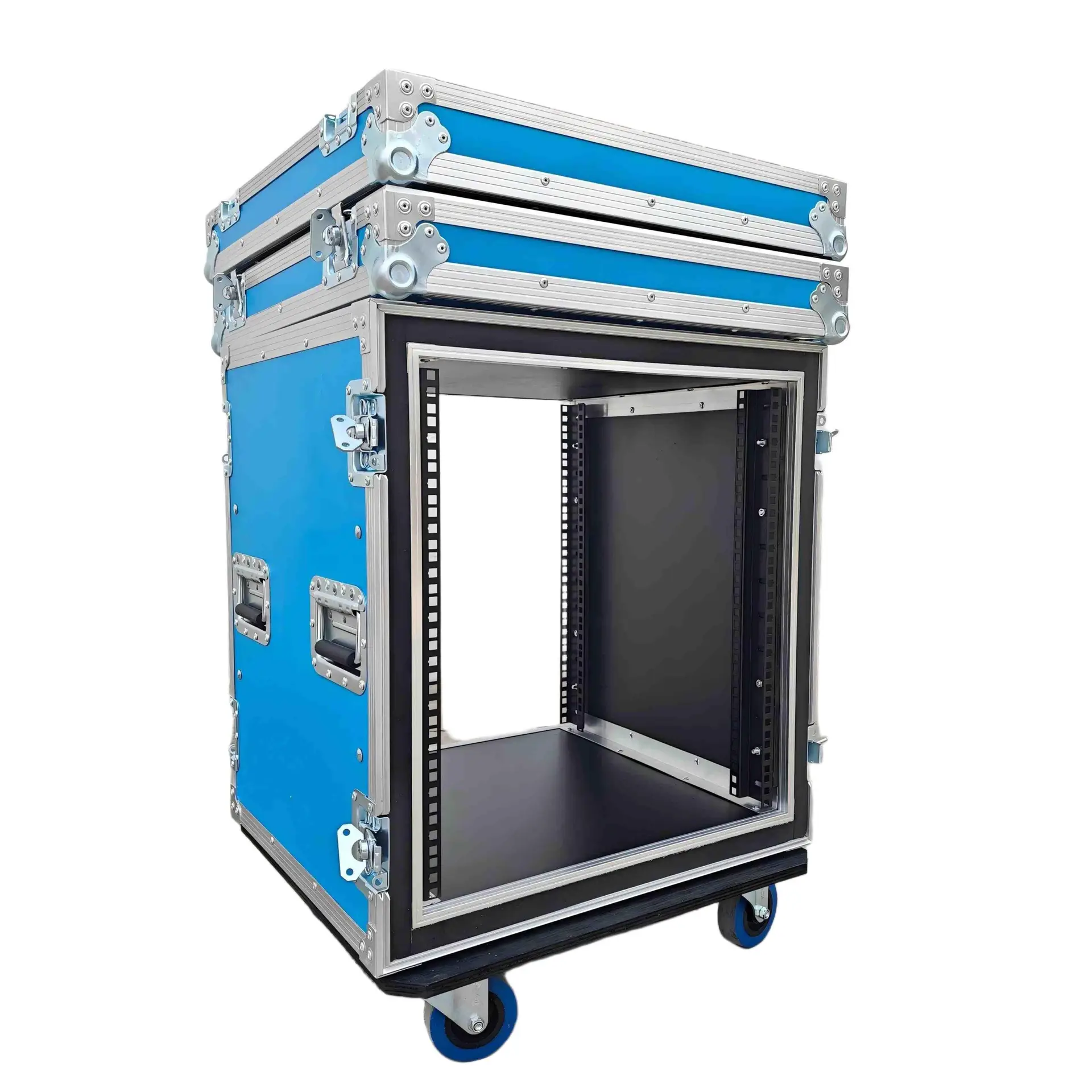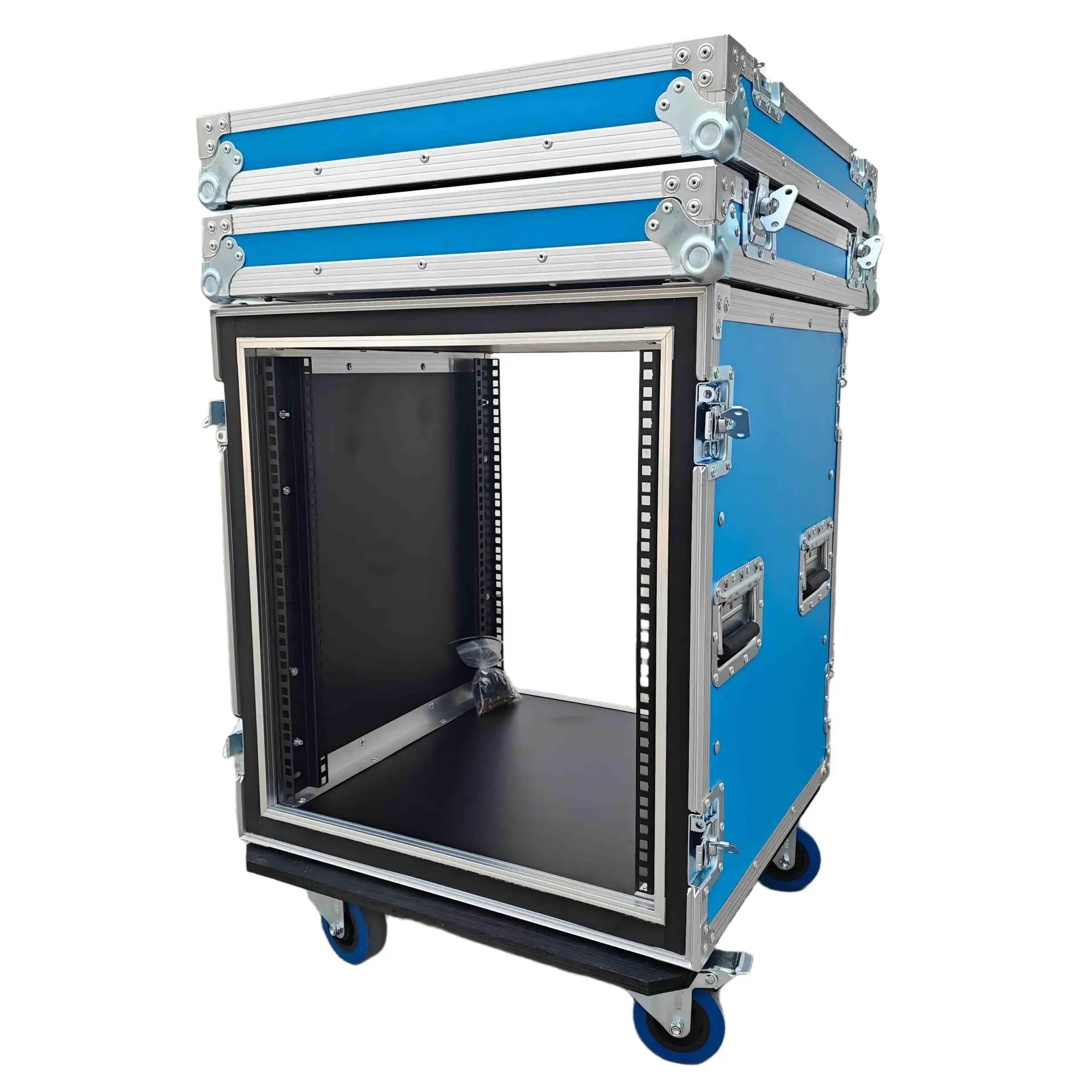 ATA Style 12U Shockproof Rack Mount Flight Case 20in. Depth with Caster Wheels. This meticulously crafted Shockproof Vertical Amplifier Rack Case serves as an exemplary storage solution, offering security and convenience for a diverse range of amplifiers, professional DJ mixers, effects units, and standard 19″ width rack-mountable pro audio/DJ/Network gear. Engineered with steadfast precision and equipped with dual mounting rails, this case assures unwavering equipment stability, eliminating the risk of displacement or slippage. Furthermore, the design prioritizes minimizing strain on rack ears, thereby enhancing overall durability and longevity.