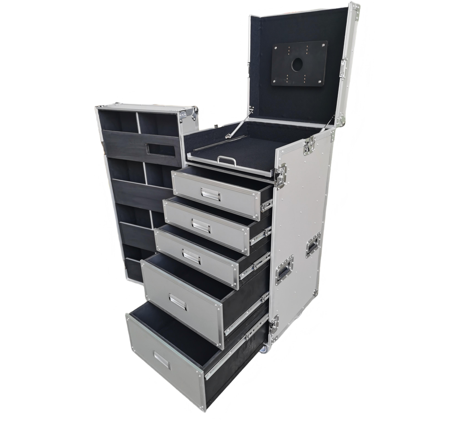 Featuring five drawers, the case provides secure and efficient storage for tools, accessories, and technical equipment. The top allows easy installation of a monitor, transforming the case into a compact mobile workstation. The interior of the door is equipped with storage space and has reserved positions for outlets.